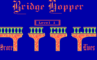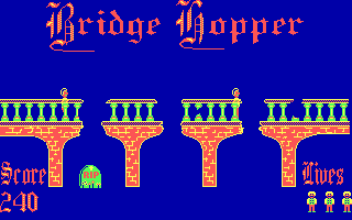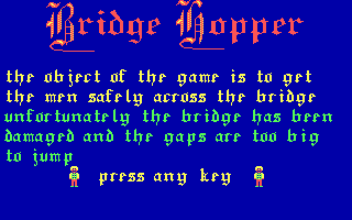Bridge Hopper challenges players to think quickly and manage a constant flow of oblivious pedestrians crossing a series of bridges riddled with sudden gaps. In early levels there are three gaps to contend with, but the difficulty ramps up from level six onward when four gaps become the norm. Rather than the simple “set it and forget it” approach of titles like Lemmings or Sleepwalker, Bridge Hopper demands that you dynamically cover holes in the bridge in real time, typing in the number of the gap you wish to seal and hitting the assign key before the next group of walkers reaches it.