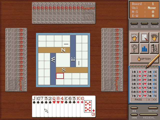 On the visual front, Bridge Olympiad opts for clean, functional 2D graphics that prioritize clarity over flashy animation. The background is a warmly lit bridge table set against the subdued elegance of the National Bridge Club’s interior. Cards are large and legible, with crisp suit icons and readable pip values—critical when you’re counting points or evaluating opponents’ bids under time pressure.