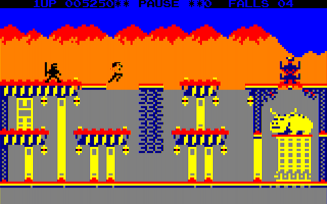 Though born in the golden age of 8-bit and 16-bit home computers, Bruce Lee’s visuals remain charmingly crisp. Character sprites are well-defined—Bruce’s lean silhouette and Yamo’s hulking form are instantly recognizable against the moody, dimly lit backgrounds. Each lantern glows with a soft yellow hue that pops against the darker tile sets, ensuring you never lose sight of your primary objective.