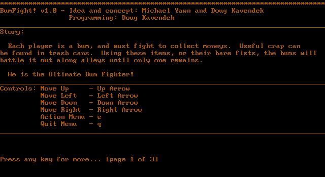Overall, the graphics won’t win any awards, but they serve their purpose. If you appreciate retro charm or recall the heyday of QBasic demos, you’ll find BumFight!’s aesthetic endearing rather than off-putting. Just don’t expect high-definition polish or elaborate cinematics.