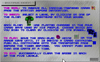 The story is delivered primarily through short text introductions at key milestones and the printed hint manual included with the registered version. While there are no fully animated cutscenes or voiced dialogue, the premise provides ample context and stakes for each puzzle. As you clear one bay after another, the narrative urgency builds, reinforcing why every crate you slide matters.
