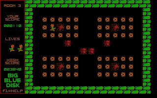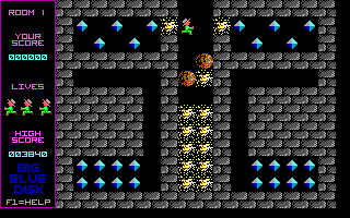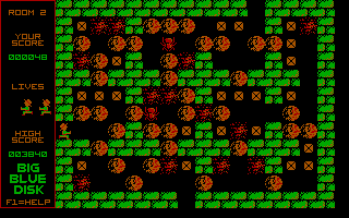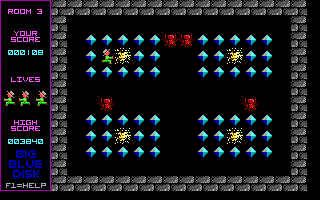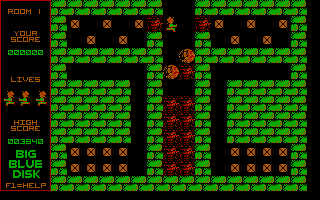 Chagunitzu’s visuals are a charming throwback to early 1990s DOS-era artistry. Its 16-color palette might feel limited by modern standards, yet the vibrant reds, greens, and blues bring each room’s stone floors and temple walls to life. Sprite animations are simple but effective, with spiders shuffling in unmistakable patterns and treasure chests flashing to signal valuable loot.