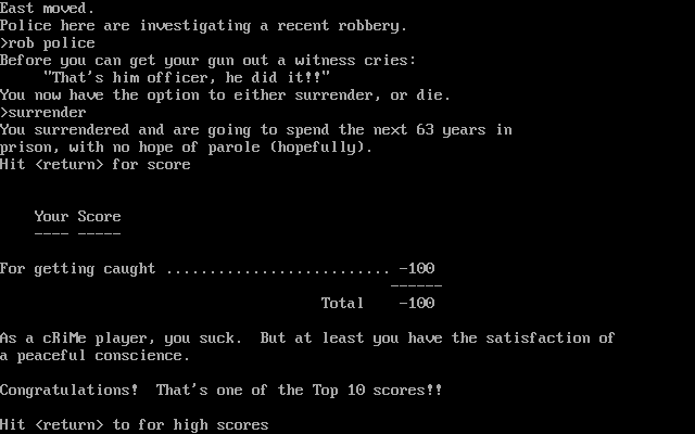 That said, its minimal interface and lack of hand-holding may frustrate players accustomed to modern conveniences like tutorials or in-game maps. cRiMe demands patience and willingness to learn through trial and error. If you’re someone who relishes emergent storytelling and the challenge of mastering a concise rule set, this text adventure will reward your perseverance.