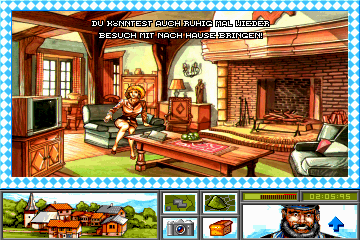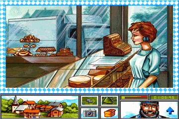 Visually, Das Amt opts for a minimalist presentation, relying on static still images of a stylized Bavarian countryside and local landmarks to set the scene. While some players may expect full-motion animations or 3D environments, the game’s art direction embraces a postcard-like aesthetic that feels both nostalgic and whimsical. Each still frame is richly detailed with period-appropriate architecture, lederhosen-clad citizens, and rolling green hills that instantly evoke the region’s rustic charm.