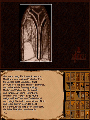 Die Kathedrale presents a rich interactive fiction experience punctuated by static illustrative scenes. You navigate St. Peter’s cathedral through a classic text parser, issuing commands to examine, move, and manipulate objects. The puzzles demand careful reading of your surroundings and thoughtful use of the parchments’ cryptic clues.