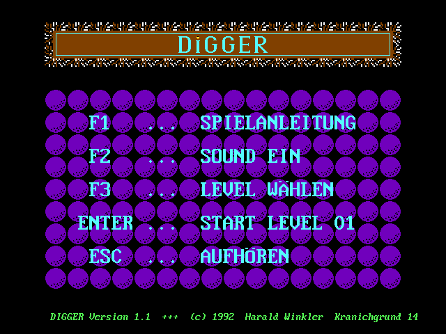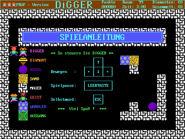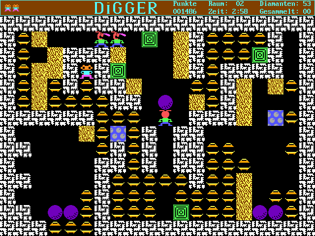 As a DOS port of an East German KC 85 original, Digger boasts crisp, high-resolution visuals that outshine many of its contemporaries. The blocky charm of the 1980s is fully intact, yet each sprite feels distinctly rendered. Diamonds gleam with a bright sparkle, rocks appear weighty and textured, and ghost sprites animate smoothly along their patrol paths. The clarity of these graphics makes it easy to track hazards and plan your next move.