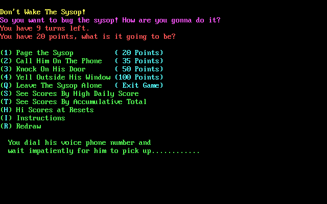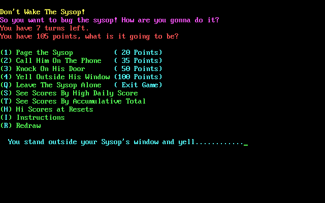 Don’t Wake the SysOp delivers a deceptively simple premise: pester the bulletin board system operator for as long as possible without triggering a disconnect. The player chooses from a variety of harassment options—sending repetitive page requests, leaving cryptic messages, or even attempting to ring the SysOp’s voice line directly. Each action carries a risk-reward balance, with higher-point stunts offering bigger scores but much greater odds of waking (and angering) your unsuspecting host.
