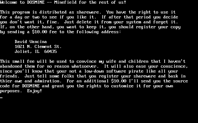 Ultimately, DOSMINE challenges you to find beauty in simplicity. Its textmode interface and absence of modern frills are not shortcomings but deliberate design choices, aimed at recapturing the tension and charm of early computing eras. For players willing to embrace the old‐school aesthetic, DOSMINE proves that great puzzles require little more than a grid, a goal, and the courage to take a leap of faith.