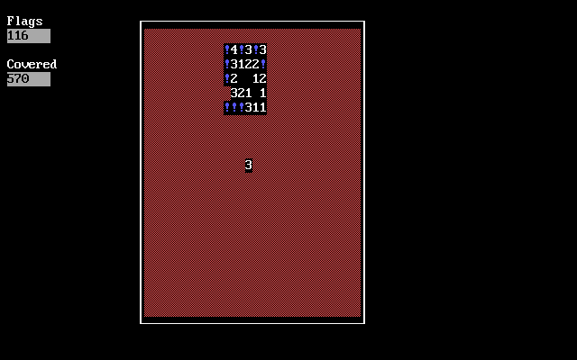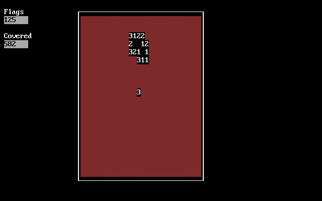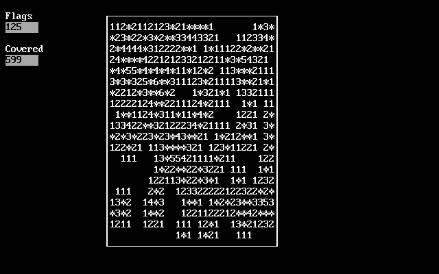 Visual fidelity in DOSMINE embraces the raw charm of textmode graphics. There are no sprites, no high‐resolution tilesets, and certainly no 3D rendering—just ASCII characters and the occasional shading block to denote flags and mines. The grid is crisp and unambiguous, with each cell represented by a single character. When a mine is revealed, a stylized “*” pops into place, alerting you to disaster in a manner that is striking in its starkness.