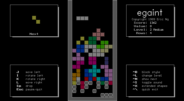 Despite a file size under 100KB, Egaint delivers surprisingly crisp visuals on early IBM PC hardware. The high-resolution block sprites are sharp and distinct, making it easy to identify even the most unusual shapes at a glance. The minimalist approach—eschewing colored backgrounds in favor of a clean playfield—keeps your focus squarely on the falling pieces.