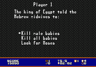 Exodus: Journey to the Promised Land loosely follows the Biblical account of Moses leading the Israelites out of Egypt. While the heavy lifting is done through action and puzzle mechanics, the game weaves in narrative elements through level introductions and the multiple‐choice question segments. Each round of questions ties directly to passages from the Book of Exodus, grounding the gameplay in its source material.