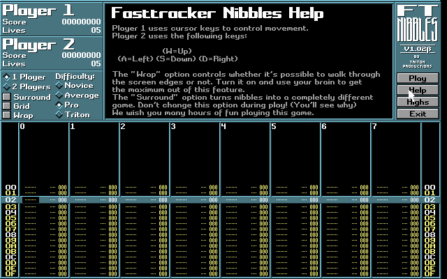When you need a break from layering snares and basslines, FastTracker 2 ships with a hidden gem: a compact clone of Microsoft QBasic’s Nibbles. This snake-style minigame effortlessly pauses your composition workflow and drops you into light-bike arenas rendered in ASCII-style graphics. You guide a growing worm through a numbered grid, chomping boxes to lengthen your tail, avoiding walls and collisions, and even wrapping around the edges when boundary barriers are disabled.