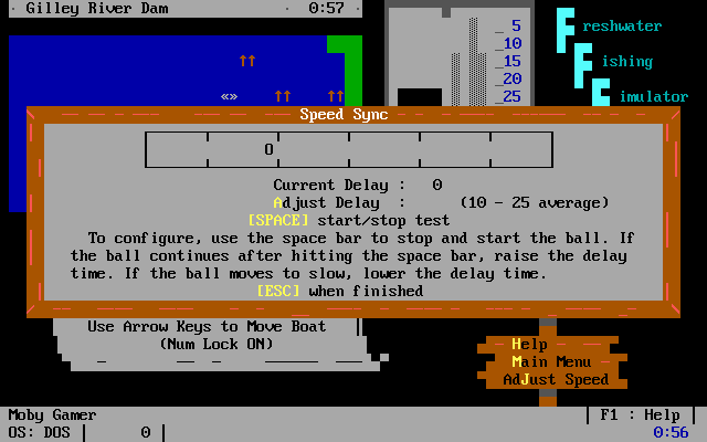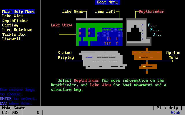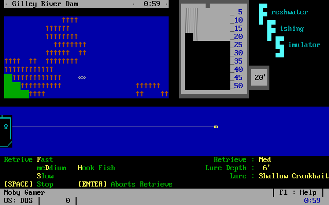 Freshwater Fishing Simulator captures the quiet tension of casting a line into a serene lake, all within the confines of a textmode BBS door game. You pilot your boat with the arrow keys, positioning yourself over ideal depths and substrate types before choosing the perfect lure and line retrieval speed. Each decision—be it the weight and color of your tackle or the angle at which you approach a promising underwater shelf—feeds into the core loop of exploration and reward.