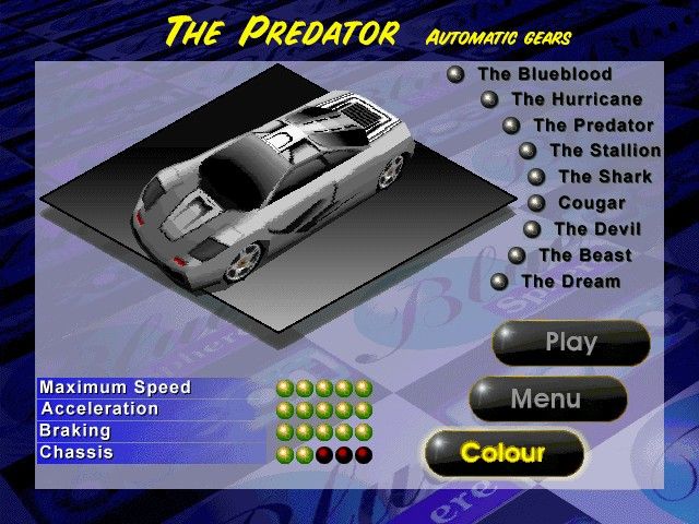 Although released in the late ’90s, GT Racing 97 boasts surprisingly crisp visuals for its era. Car models like the Predator and Hurricane exhibit smooth curves and readable decals that stick out against the varied backdrops of European villages, desert passes, and coastal highways. Textures are textured well enough to convey different road surfaces, giving you visual cues about grip and handling when you push your car to its limits.