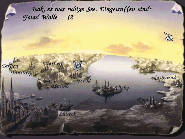 When you dock in a city, hand-drawn illustrations of Lübeck, Riga, Malmö, and Novgorod convey a sense of place, each with unique architectural flourishes. While animations are modest—sailing ships rock gently and cannon fire flashes briefly during combat—the art direction leans into historical authenticity, with townscapes that reflect regional character without overwhelming the interface.