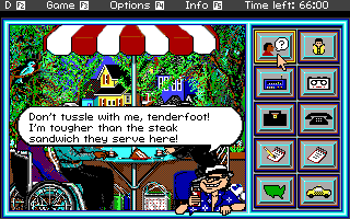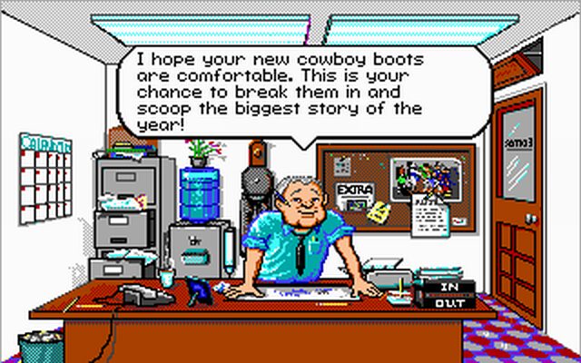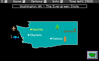 Headline Harry and The Great Paper Race embraces a late-20th-century PC graphics style, featuring colorful pixel art and static backgrounds that evoke classic educational titles. Each city or landmark—from Cape Canaveral’s launchpad to New York’s bustling newsroom—is rendered with enough detail to feel recognizable, even if the animations are modest by modern standards. The sprite work on characters, including Headline Harry himself in his trademark fedora, strikes a charming balance between cartoonish and informative.