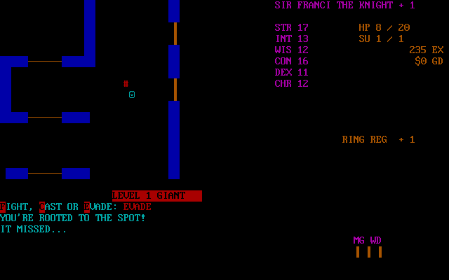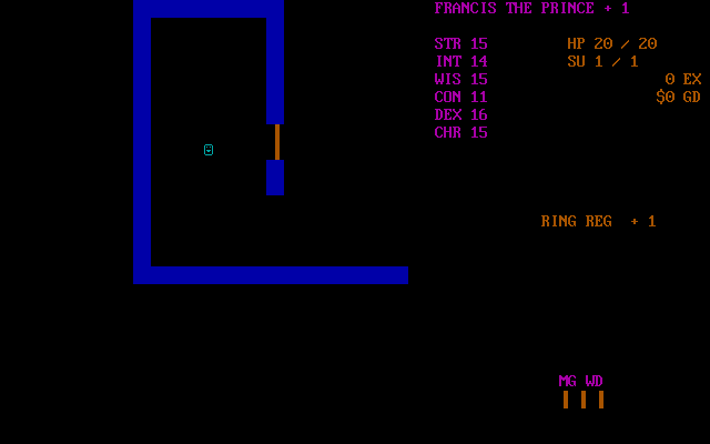 The core interface delivers a text-based 3×3 top-down view of your immediate surroundings, accompanied by a status panel to the right and message log below. This layout may feel sparse by modern standards, yet it provides all essential information—your hit points, spell points, inventory notifications, and environmental cues—in an intuitive fashion. Combat is resolved through simple menu choices, while exploration encourages you to probe every hallway, room, and hidden teleporter in search of the Lord Master.