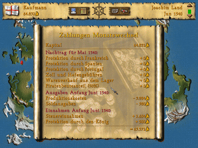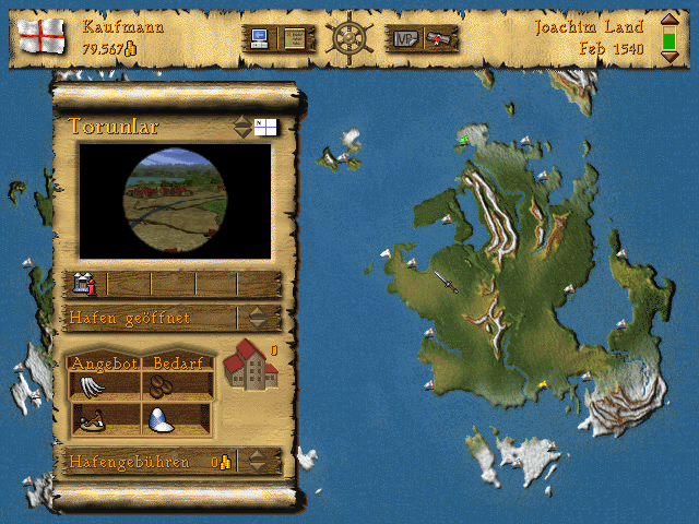Visually, Herrscher der Meere opts for a clean, top-down aesthetic that emphasizes clarity over flashy effects—ideal for a deep economic simulation where information is key. The sea map is peppered with animated sails, and subtle wave movements lend life to otherwise static water textures. While not aiming for photo-realism, the game’s art style effectively conveys the atmosphere of open oceans and bustling ports.