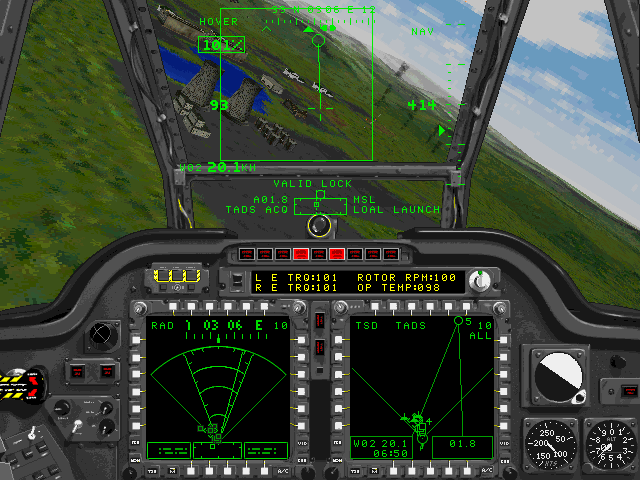 The centerpiece of the simulation is the Longbow’s advanced millimeter-wave radar. Scanning for enemy targets over rugged terrain becomes a tactical puzzle: you must manage your radar modes, interpret contacts, and coordinate missile launches while maintaining situational awareness. Combined with the chain gun, FFAR rocket pods, Stinger missiles, and anti-radar missiles, the variety of weapon systems ensures that each engagement feels dynamic and varied.