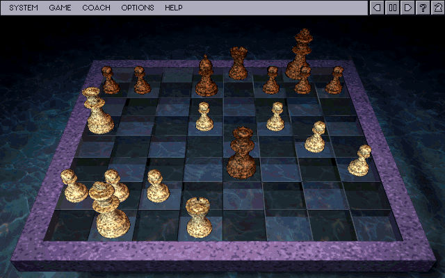 Kasparov’s Gambit showcases an SVGA isometric board that strikes a pleasing balance between clarity and style. The pieces are rendered with enough detail to distinguish classic designs—Staunton, glass, and themed sets—while maintaining smooth animation as they glide into position. The isometric perspective gives the board a three-dimensional feel without sacrificing visibility of individual squares.