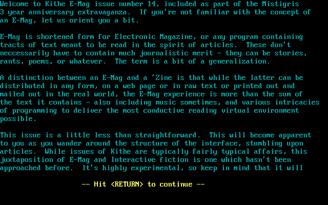 Ambient sound effects—keyboard clicks, faint modem beeps, the rustling of pages—play softly in the background, adding another dimension to the otherwise text‐only presentation. Though these audio cues are subtle, they underscore the tactile pleasure of poring over virtual pages. In an age of photorealistic graphics, Kithe #14 reminds us that atmosphere can be constructed entirely through imagination and skillful text design.