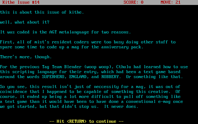 Kithe #14 reimagines classic text adventures by embedding hundreds of digitized articles from the Mistigris e-mag within a sprawling library environment. Players navigate through interconnected rooms by typing standard text-adventure commands—GO NORTH, TAKE LAMP, READ SCROLL—and uncovering hidden passages by leveraging keywords pulled directly from the archived articles. This blend of literary exploration and puzzle‐solving creates a satisfying feedback loop: solve a mini‐riddle to unlock a new article, then use the insights gained to press onward.