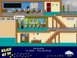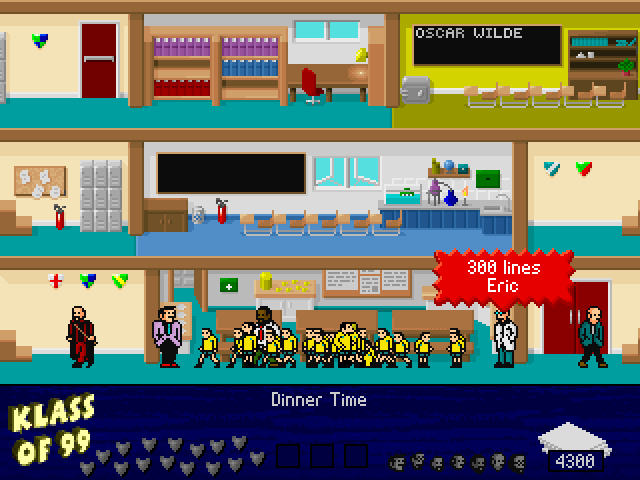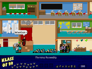 Klass of ’99 stays remarkably faithful to the original 1985 Skool Daze formula, delivering a mix of stealth, strategy, and lighthearted mischief. You guide Eric through a multi-room, side-scrolling school building, balancing the need to attend classes with the urge to wreak playful havoc. Each day presents a fresh challenge: sneak past teachers, dodge snitches like Einstein, and carve out opportunities to advance your main objective—erasing your disastrous report from the headmaster’s computer.