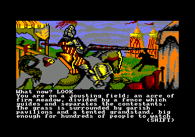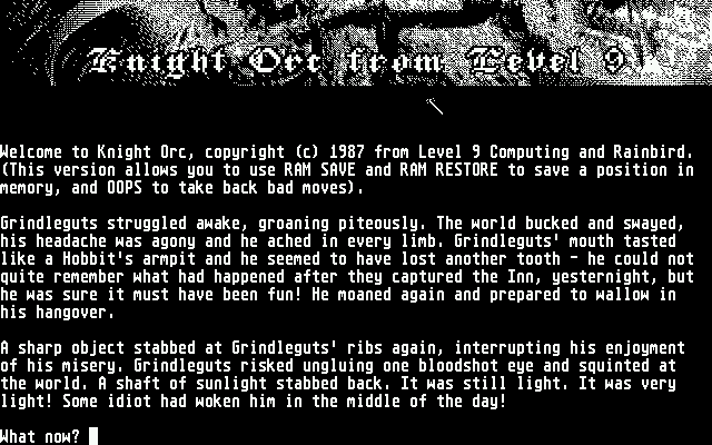 Knight Orc offers a unique blend of classic text-adventure mechanics with a layer of real-time simulation that sets it apart from typical interactive fiction. As Gringleguts the Orc, you navigate a richly detailed world described through evocative prose, typing commands to explore, converse, and solve puzzles. Every action you take unfolds against a ticking clock: NPCs and creatures are on schedules, wandering from place to place, conducting business and going about their daily routines.