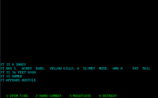 Although Landing Party is fundamentally text-based, its presentation is polished and thoughtfully designed. The interface uses clear typography and color-coding—red for threats, green for allies, and blue for neutral or informational text—to quickly convey the nature of each encounter. Subtle ASCII art flourishes, such as stylized monsters or simple planetary landscapes, punctuate the prose and help visualize your perilous surroundings.