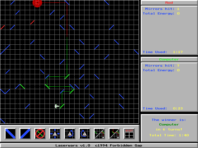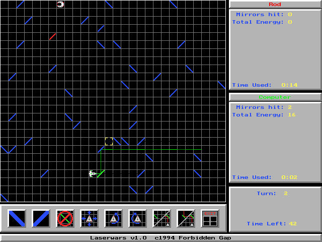 Laserwars takes the core appeal of classic artillery games—where players must judge angles, trajectories, and environmental factors—and reframes it around deadly photons instead of cannonballs. Each turn unfolds on a neatly gridded arena, forcing you to weigh mirror placement, beam bounces, and line-of-sight before pulling the trigger. The absence of wind and gravity as variables is a welcome simplification, allowing new players to focus on the elegant complexity of 90-degree reflections and tactical positioning.