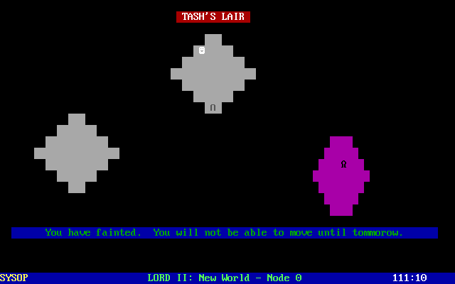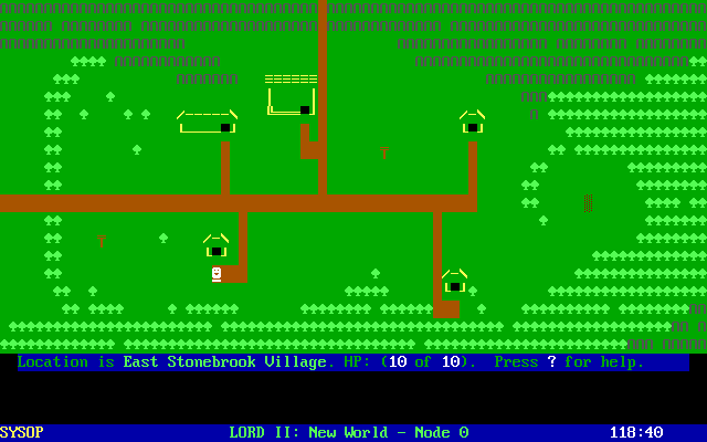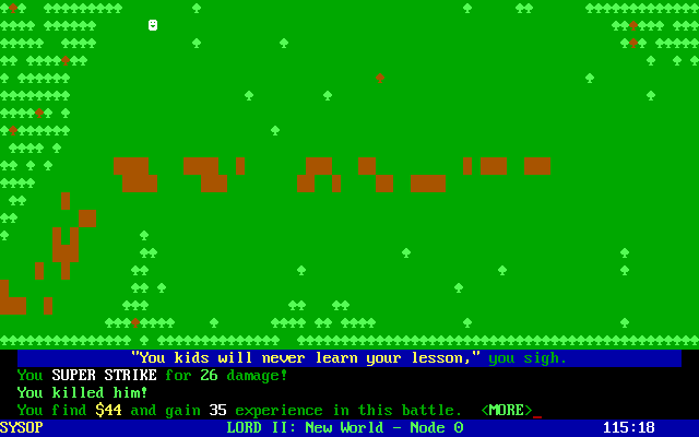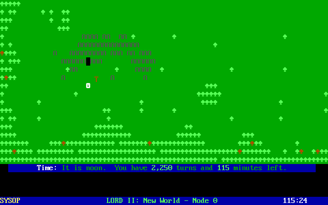 Legend of the Red Dragon II: New World revolutionizes the series’ gameplay by blending elements of Ultima, ZZT and Habitat into a real-time multiplayer BBS door. Unlike its predecessor, which leaned heavily on text menus and turn-based combat, New World offers a sprawling sandbox where you can roam freely, interact with other players in real time and shape the fate of an entire kingdom. Movement occurs on a massive world map, allowing you to travel between cities, forests, mountains and seedy roadside taverns—all in the same session.