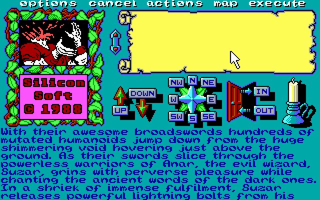 Interface elements remain unobtrusive: single-icon buttons for movement and entry complement the text parser without cluttering the screen. Inventory and map screens employ clean layouts that prioritize readability over flashy visuals. Although minimally decorated, these menus fit the game’s old-school sensibilities, ensuring that the focus stays on exploration and puzzle-solving.