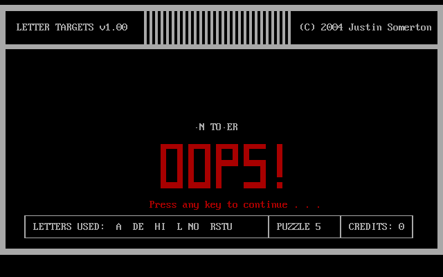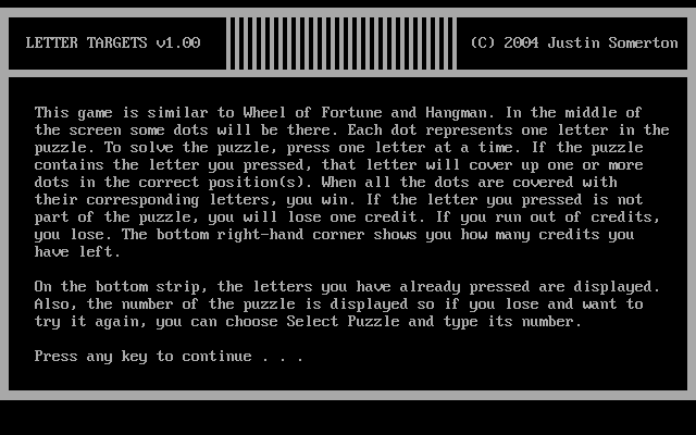 Embracing the nostalgia of old-school PC gaming, Letter Targets uses an ASCII-style interface that feels like a throwback to terminal-based adventures. Characters, borders, and the puzzle grid all render crisply in text, ensuring every letter and dot is easy to read, even on high-resolution displays.