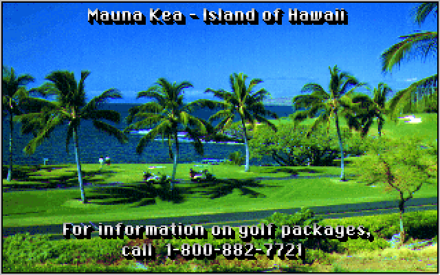 Visually, Mauna Kea leverages the graphical capabilities of its host engines to stunning effect. The azure ocean vistas, framed by rugged black lava outcroppings, create a striking backdrop that pops even on standard VGA displays. Palm trees sway gently in the digital breeze, and distant mountains have a subtle haze that gives a sense of scale and realism.
