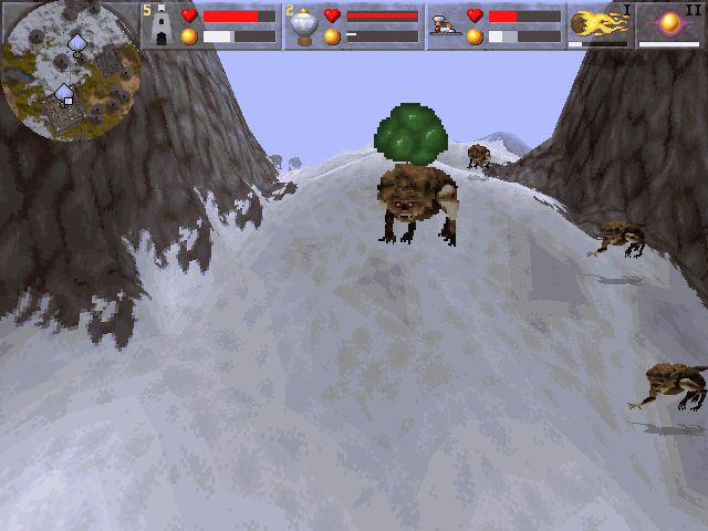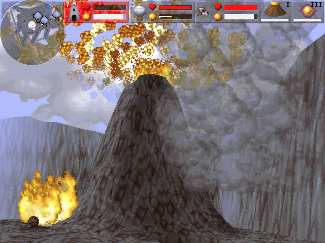 The shift to a fully 3D engine is immediately noticeable in Magic Carpet 2. Textures are richer and more detailed compared to the original, with craggy mountainsides, shimmering lakes, and architecturally varied castles that evoke each Netherworld’s unique aesthetic. Lighting effects have also been overhauled: dynamic day-night cycles cast realistic shadows across rolling landscapes, and the glow of magical spells illuminates nearby terrain with vibrant color.