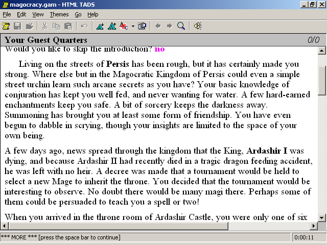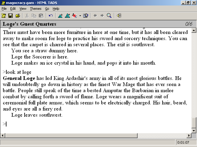 The TADS-based interface feels like a modernized MUD, emphasizing terse but precise descriptions and robust command parsing. You’ll hack your way through dungeon denizens and decipher cryptic runes to boost your nascent magical abilities. Rather than handing you a detailed walkthrough, Magocracy forces you to piece together the layout of the castle, the locations of rival grimoires, and the timing of events by sheer observation and experimentation.