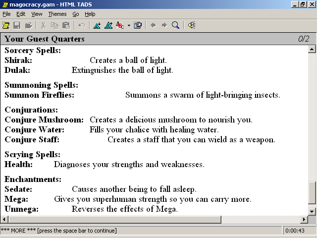 As a purely text-based title, Magocracy forgoes visual flair in favor of rich, evocative prose. There are no character portraits or tiled maps—everything is relayed through concise descriptions that paint mental pictures of torchlit halls, spider-infested cellars, and arcane altars. Where other games might rely on pixel art, Magocracy trusts your imagination to conjure the scene.