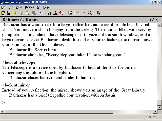 The TADS engine provides a clean, responsive command window with instant scrollback and clear text formatting. Commands are echoed and parsed instantly, and contextual hints (such as available exits or visible items) appear in-line without cluttering the screen. This minimalist design keeps the focus squarely on strategy and exploration rather than on graphical bells and whistles.