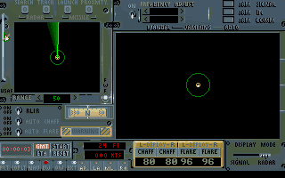 The outside visuals are characteristic of early 1990s simulation titles, featuring textured terrain, simple but effective horizon fog, and sprite-based enemy aircraft that rotate to face your bomber. While polygon counts are modest by today’s standards, the game paints convincing desert landscapes, rolling mountain ranges, and cityscapes that feel appropriately forbidding. When you’re climbing above 30,000 feet, the gradient of the sky and distant horizon lend a genuine sense of scale.