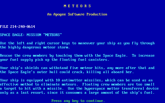 In summary, Meteors offers an engaging blend of fast-paced action, resource management, and rescue-based objectives. Its minimalist graphics and focused storytelling may not appeal to everyone, but for fans of arcade shooters and high-score challenges, this is one meteor storm worth weathering.