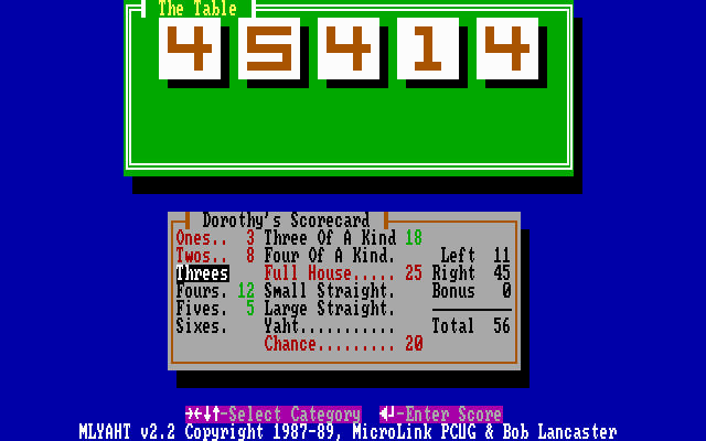 Sound is handled through the PC speaker, delivering simple beeps when dice roll and a triumphant tone for a successful Yahtzee. While not a full-fledged soundtrack, these audio cues serve their purpose, providing satisfying feedback without overwhelming the ears. In sum, the graphics and sound work together to create a functional yet charming retro ambiance that suits the straightforward nature of the game.