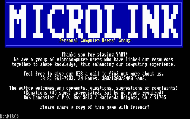 As a piece of gaming history, MicroLink Yaht demonstrates how much fun can be had even on early PC hardware. The ANSI visuals and PC speaker beeps evoke a strong sense of nostalgia for anyone who grew up gaming on DOS-era machines. Yet its straightforward design means it still holds up today as a simple, addictive time-killer—perfect for a coffee break or a fun competition with friends.