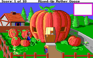 This enhanced version of Mixed-Up Mother Goose takes full advantage of Sierra’s SCI engine to deliver richer, more colorful visuals than its predecessor. Backgrounds have been redrawn with a softer palette and greater detail, from the cobblestone paths winding between gingerbread houses to the lush fields where the characters roam. Subtle animations—like flickering lanterns, swaying flowers, and the bouncy gait of Humpty Dumpty—inject life into each scene without pushing the boundaries of hardware too far.