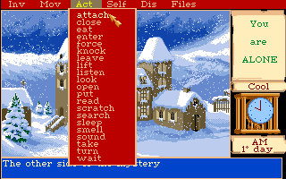 The interface relies on a drop-down menu system featuring roughly 20 verbs—such as “examine,” “speak,” and “use”—which you combine with on-screen hotspots to interact with people and objects. While this verb-based control can feel dated compared to modern point-and-click conventions, it rewards careful experimentation: selecting the right verb at the right time often leads to subtle discoveries or new dialogue options that push the narrative forward.