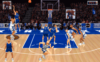 NCAA Championship Basketball uses VGA graphics with 2D sprites layered over pre-rendered court backgrounds. While it may not rival the polygon counts of contemporary 3D titles, the hand-drawn sprites retain a crisp, retro charm. Player silhouettes are distinct enough to spot your star guard driving to the rim or your big man posting up in the paint.