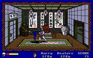 Combat is built around a simple punch-and-kick system, but the challenge ramps up quickly as you progress. You start on the main thoroughfare facing a lone punk; dispatch him to collect his cache, then head to the stairwell to confront a chainsaw-wielding thug. Along the way you’ll lock horns with ninjas, amazons and other low-lives, each requiring different strategies to subdue without weapons. Your only savior is the barrel of flames waiting outside the town limits, where sacrifices of seized drugs restore your dwindling energy bar.