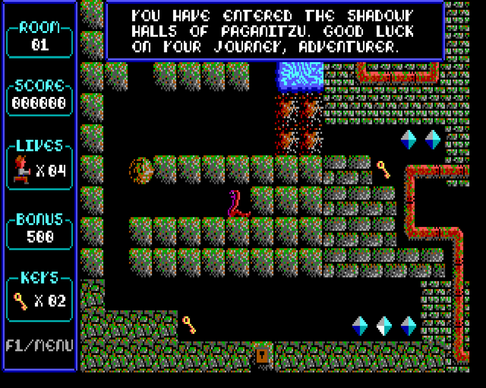 Though Paganitzu hails from an era when VGA resolutions dominated, its pixel art remains surprisingly vibrant and clear. Each episode sports a unique color palette—rosy pinks and greens in “Romancing The Rose,” steely silvers and grays in “Quest For The Silver Dagger,” and lush jungle hues in “Jewel Of The Yucatan.” This visual variety keeps each chapter feeling fresh and helps distinguish environmental hazards from collectible items.