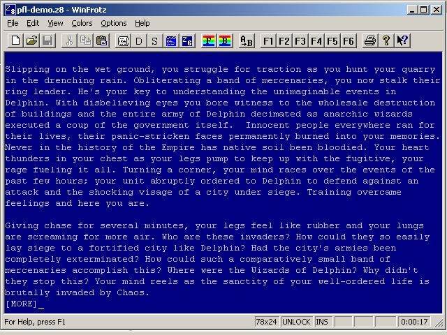 Pentari: First Light plunges you into a sprawling text-adventure world that blends classic interactive fiction with modern convenience. As a military captain, you’ll issue commands in natural language, guiding your character through the besieged city, castle corridors, and subterranean tunnels. The parser is intuitive and responsive, recognizing a wide variety of inputs—from “examine the shattered gate” to “use Trump to teleport to the Royal Library”—so you rarely feel constrained by rigid command sets.
