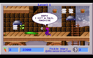 Pickle Wars embraces old-school platforming with surprisingly modern flair courtesy of its dual parallax scrolling. As Dave, you’ll run, jump, shoot and climb through sprawling levels that unfurl in multiple layers of foreground and background, giving each stage a sense of depth rarely seen in shareware titles of its era. The responsive controls let you chain precise jumps and mid-air shots with your trusty Salad Shooter, making movement as satisfying as the combat itself.