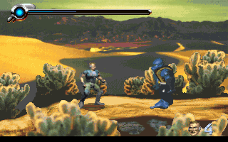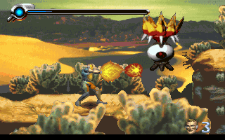 The animated sprites of the Ranaxian hero and his alien adversaries are colorful and packed with personality. Fireball effects light up the screen with a satisfying glow, and enemy designs vary from lanky insectoids to hulking robotic sentinels, each with unique movement patterns and attack telegraphs. Despite the pre-rendered approach, the characters never feel out of place against their 3D stages—thanks to consistent shading and carefully matched color palettes.